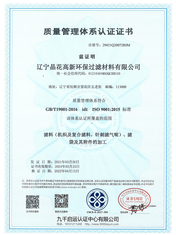遼寧晶花高新環(huán)保過濾材料有限公司主要生產設備來自德國海爾格特、布魯克耐、庫斯特公司,針刺梳理設備來自英國,極大提高產品抱合能力、均勻度.....